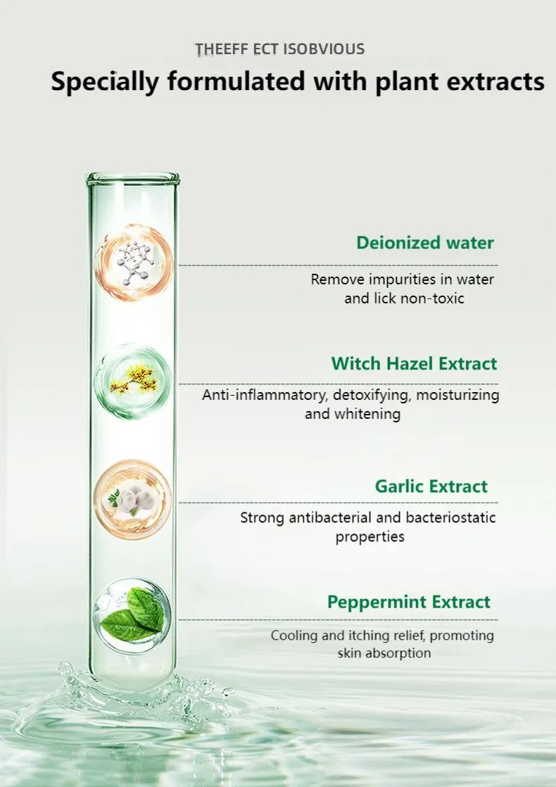 | Composition | Deionized water, nano silver, Sophora flavescens, Hamamelis virginiana, mint extract, boric acid, zinc ion preparation, propylene glycol, betaine salicylate, phytosphingosine, etc. |